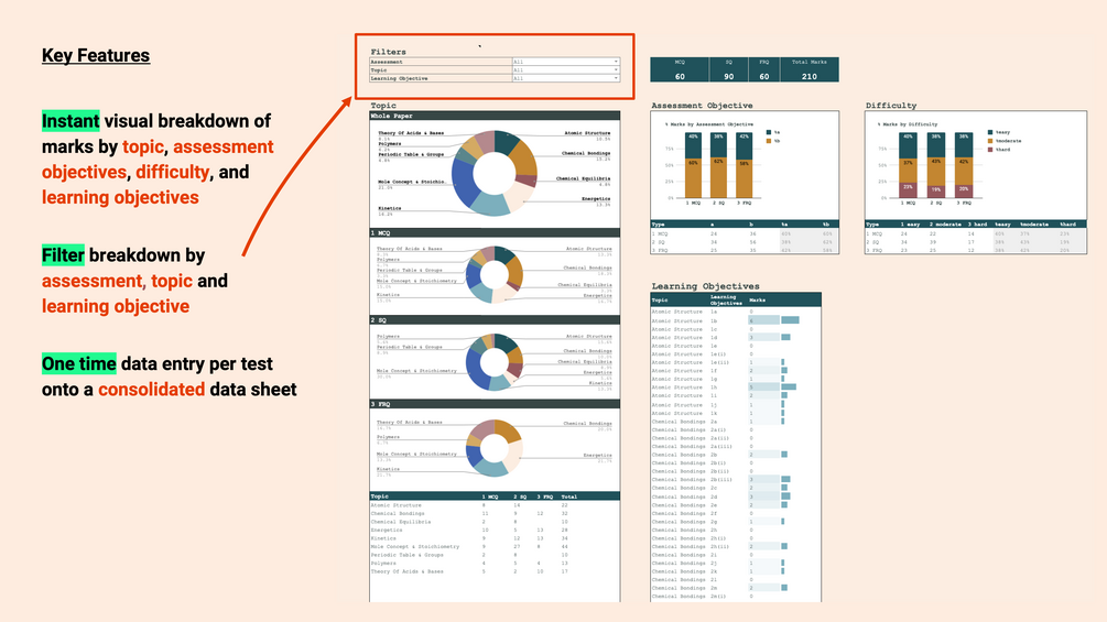 - Instant visual breakdown of marks by topic, assessment objectives, difficulty, and learning objectives