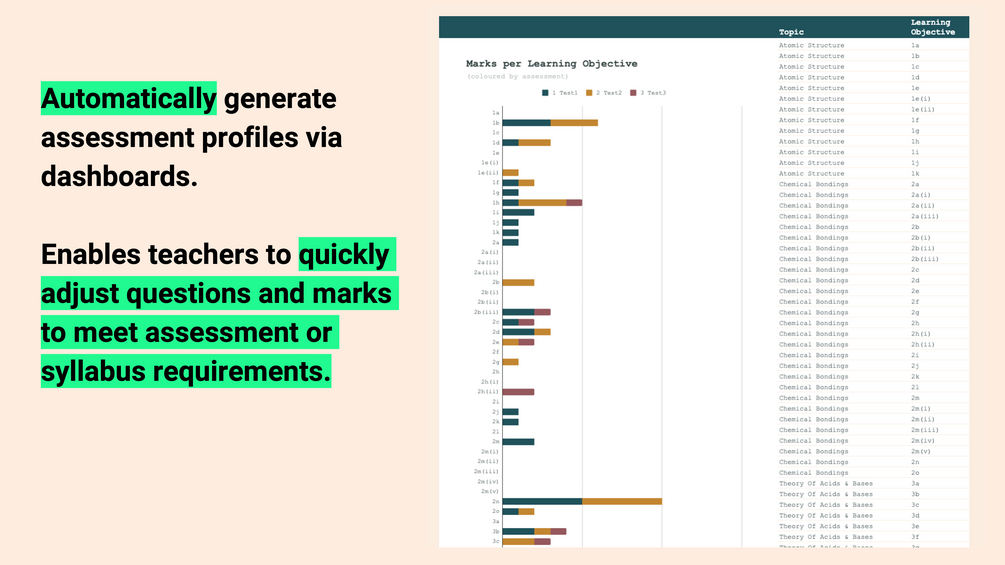 - Teachers can analyse the extent each learning objective in the syllabus has been tested in all assessments administered to a cohort